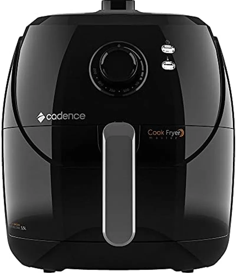 A Cadence Cook Fryer Master FRT600 é uma airfryer de entrada com 5,5 litros de capacidade, 1.700W de potência e controle analógico com 6 níveis de temperatura. Indicada para famílias de 3 a 5 pessoas que buscam preço acessível, mas com limitações em funcionalidades e acabamento.