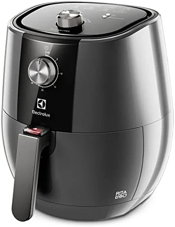 Resumo: A Electrolux EAF30 Grand é uma airfryer analógica de 4L com 1.400W, controle mecânico com dois seletores rotativos (temperatura e timer), aviso sonoro ao finalizar e desligamento automático. Cesto removível antiaderente redondo com cuba de 4,7L, 8 receitas pré-sugeridas em parceria com Rita Lobo. Timer de até 30 minutos e temperatura de 80°C a 200°C. Ideal para 1 a 4 pessoas.