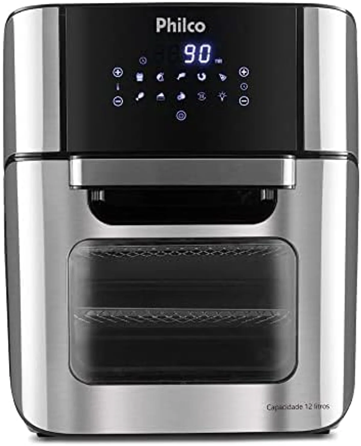 A Philco Air Fry Oven PFR2200P e uma fritadeira 4 em 1 com 12 litros de capacidade, painel digital com 9 funcoes, funcao desidratar exclusiva na faixa de preco, 1800W de potencia e controle de temperatura de 80°C a 200°C. A air fryer oven mais vendida do Brasil com mais de 17.000 avaliacoes na Amazon.